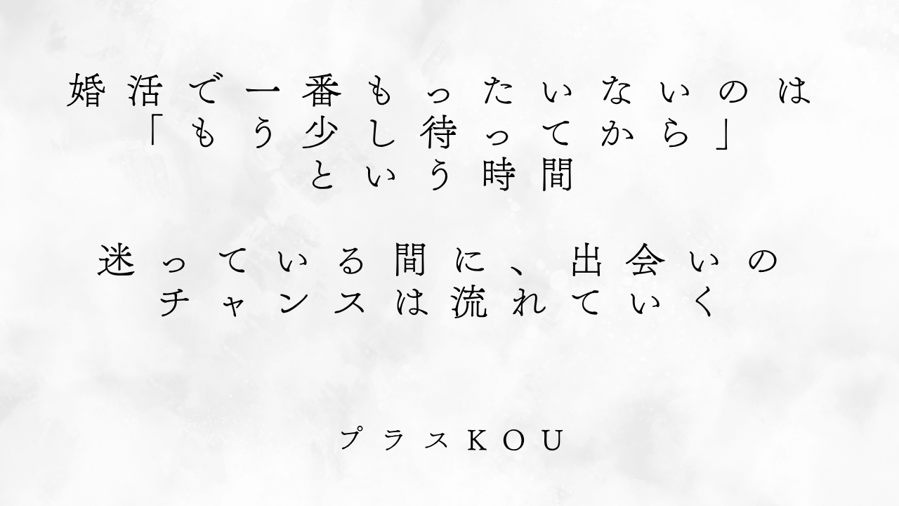 「もう少し様子を見てから…」その一言が、婚活で一番もったいない。婚活市場は常に動いています。迷っている間に、出会えたはずの人とタイミングがズレていく。準備が整ってから動くのではなく、動きながら整えていく。それが婚活で結果を出す人の共通点です。福岡の結婚相談所プラスKOUが、あなたの「今」を全力でサポートします。