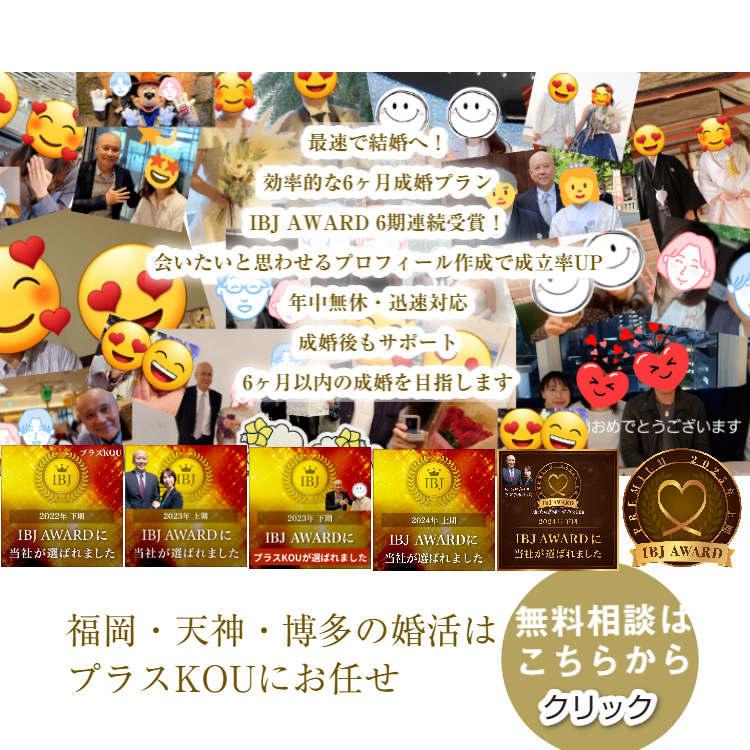 福岡・天神・博多でおすすめのIBJ加盟結婚相談所プラスKOUが、6ヶ月以内成婚を目指す婚活完全ガイドをご紹介。年中無休サポート、24時間対応で理想のパートナーとの出会いを実現。成功事例多数の婚活アドバイザーKOUが、あなたの幸せな結婚をサポートします。