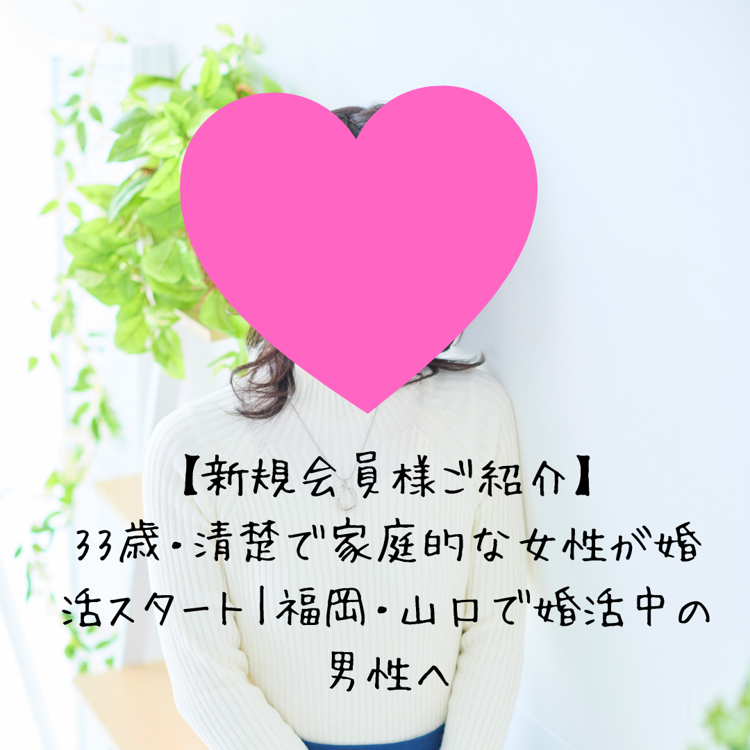 33歳、山口県在住の女性会員様。清楚な雰囲気と優しい笑顔が印象的で、お話ししていると自然と心が和む、そんな素敵な方が婚活をスタートされました。